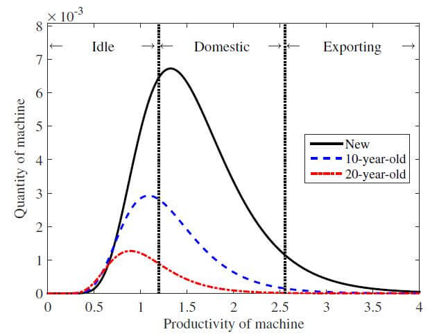 過去の代表的な研究として、資本財の製造年数と貿易の関係を理論的に検証したものがあります。既存研究で生産性と輸出の関係が検証されてきたのを補完し、製造年数と貿易の関係を示したものです。新しい資本財は平均して生産性が高く、その中でもとくに生産性の高い資本財が輸出に使われる一方、古くなった資本財は陳腐化することで生産性が低く置き換えられていくことをあらわしています。