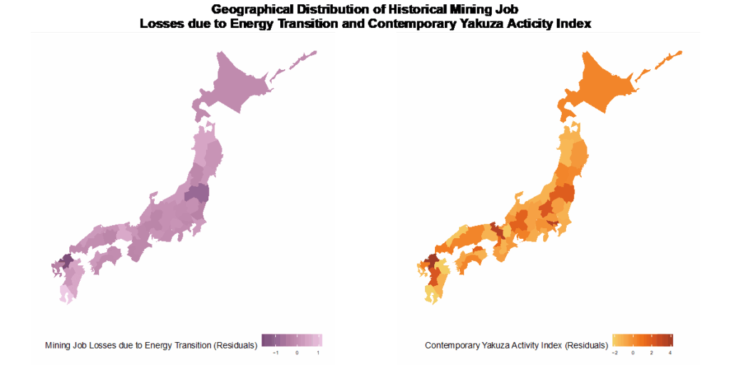 第1の研究テーマ:日本では1960年代年の原油輸入自由化と石炭政策の転換を機に、石炭から石油へのエネルギー源の転換、いわゆるエネルギー革命が起こりました。当時、炭鉱地域の一部のヤクザは、私的保護の提供や労働介入を資金源としていました。本研究では、1960年代のエネルギー革命が、短期および長期に渡りヤクザの活動にどのような影響をもたらしたかについて検討しています。下の図は、歴史的に石油輸入による炭鉱労働者の減少が顕著であった地域ほど、2000年代以降のヤクザの活動が活発になっていることを示しています。