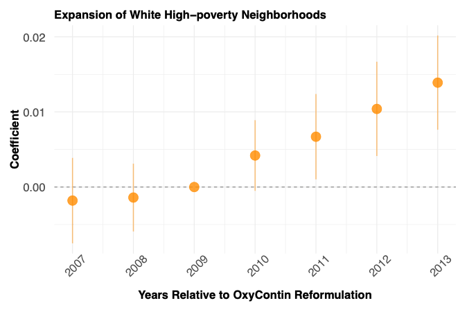 第2の研究テーマ:日本では近年、市販薬による過剰摂取(オーバードーズ)という問題が注目されるようになりましたが、アメリカでは1990年代後半から、オピオイドと呼ばれる処方鎮痛剤による薬物乱用が深刻な公衆衛生問題となっています。初期段階では、健康保険の加入率における人種間の格差により、白人層が大きな影響を受けました。本研究では、処方薬であるオピオイドの乱用を抑止するために導入された政策が、近隣変化に及ぼす影響を検討しています。下の図は、政策導入後に、貧困白人層の集住地域が増加していることを示しています。
