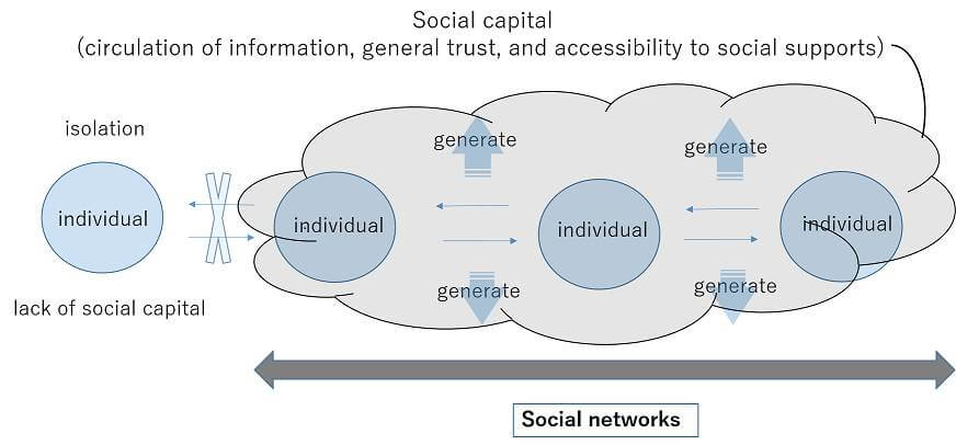 ところで、人々が社会資本を得るのは交流ネットワークに包摂されることによってです。社会資本は外部から与えることができず、人々の相互作用の中から生み出すしかないものです。では、そのようなネットワークとはどのようなものであり、どうやって支援すればできるのでしょうか。そのような課題に現在取り組んでいます。