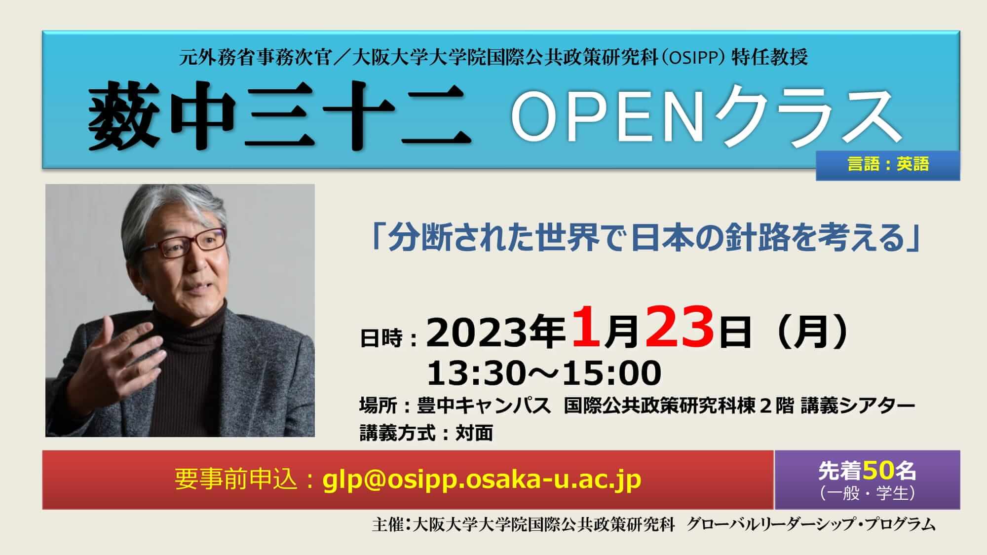 要事前申込: [encode]glp@osipp.osaka-u.ac.jp[/encode] 先着50名 (一般・学生)